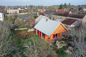 The overgrown property offers a view of the village center through a small valley. The idea was to build a simple wooden cabin in the upper area. The elevated structure offers a large living space with a view, ancillary rooms and a mezzanine with sleeping space for a family.